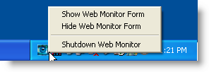 In addition Web Monitor can run as a taskbar application by using the -TrayIcon command line option to WebMonitor.exe. This will let Web Monitor run in the taskbar and allow activation and hiding of the application through the taskbar icon.