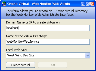 Simply pick the local domain (localhost usually) and local site to create the virtual directory on, then click Create to create the virtual directory. If the call succeeded you can click the Test button to go directly to the site and check it out.