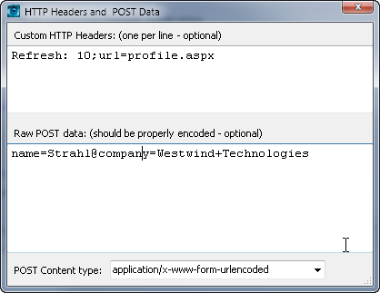 The POST data form allows you to add custom HTTP Headers and raw POST content to a request made against a Web site. This makes it possible to test requests that require form data or special headers as input. Using this form it's also possible to create requests that access Web Services by specifying SOAP headers and sending a fully formatted SOAP request.
