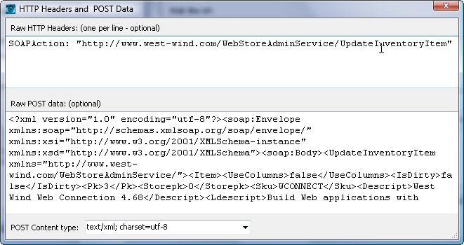 Next if the service requires Windows or HTTP authentication make sure you specify it to access the resource as usual. To create a valid HTTP Request that the service can process you also need to add Headers and POST data. Specifically: