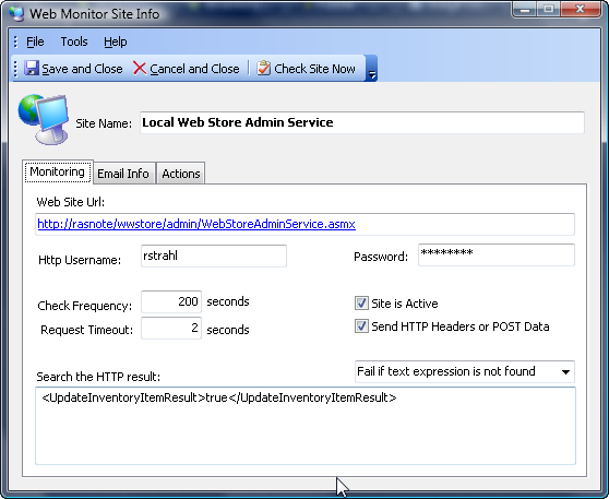Note that using Fiddler is optional. You can also skip this step and paste your XML request and headers completely manually and try out the operation by clicking the the Check Site Now in the Web Site dialog. However, Fiddler or another HTTP proxy is still quite useful to verify what data was returned on the last request.