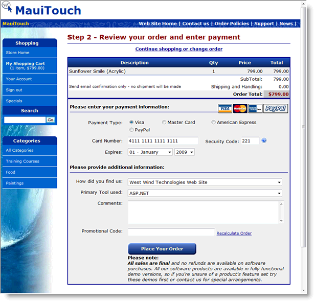 The next form redisplays the order information and prompts for payment info: