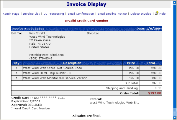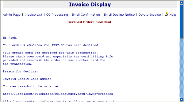 If an order was declined you might want to also send an email to the invoice recipient and let them know. By default this email sends off a note that says that the order was declined and it sends along the parsed CC validation code which usually holds a reasonably useful error message. The confirmation is sent with the Invoice number and your store name in the subject.