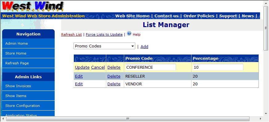 This form provides access to editing several common lists used in the Web Store.