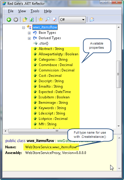 The trickiest part about instantiating new types in any complex Web Service is knowing which type you actually need to instantiate for a new object. How do you know that you have to use WebStoreService.wws_itemsRow in the example above? The easiest way to discover types is by looking at the .NET Proxy assembly with Reflector.