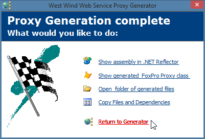 After you've generated the files you can also let the generator create a 'distribution' copy for you, which copies all files required to run the generated FoxPro proxy class from a single folder location. In addition to the generated files discussed in the previous section this copy also copies wwDotNetBridge.dll, wwIpstuff.dll, wconnect.h, wwUtils.prg and wwDotnetBridge.prg to the specified directory.