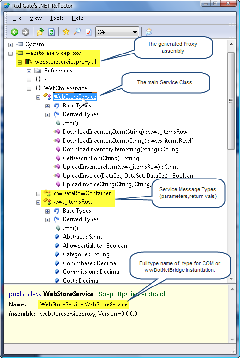 Browsing the .NET assembly with .NET Reflector is extremely useful for more complex services as you can view the full Web service definition as a class browser type view. You can see the main service class as well as each of the related message classes and enumerated (restriction) types that the Web service publishes.