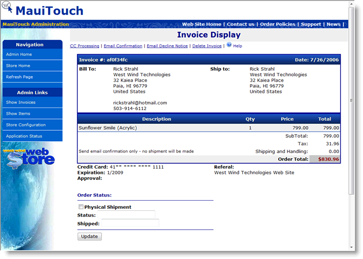 Note that the default store installation doesn't process credit cards at this point. Rather you can use the admin module to process the credit card at a later point in time. However, it's easy to add this functionality to the store with a switch. Once the order has been placed the user sees a confirmation page:
