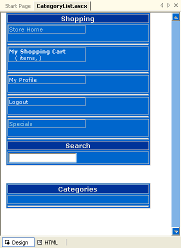 The CategoryList page is used on every page of the public interface of the Web Store. Although it has a few quirky pieces of code embedded inside of it, it's easy to use with a single embeddable tag. You can easily customize this control for your own needs. Keep in mind that the visual formatting aspects of the control is controlled through the style sheet. So if you want to change the look of the control you should look into the various style sheet properties for the CategoryList first.