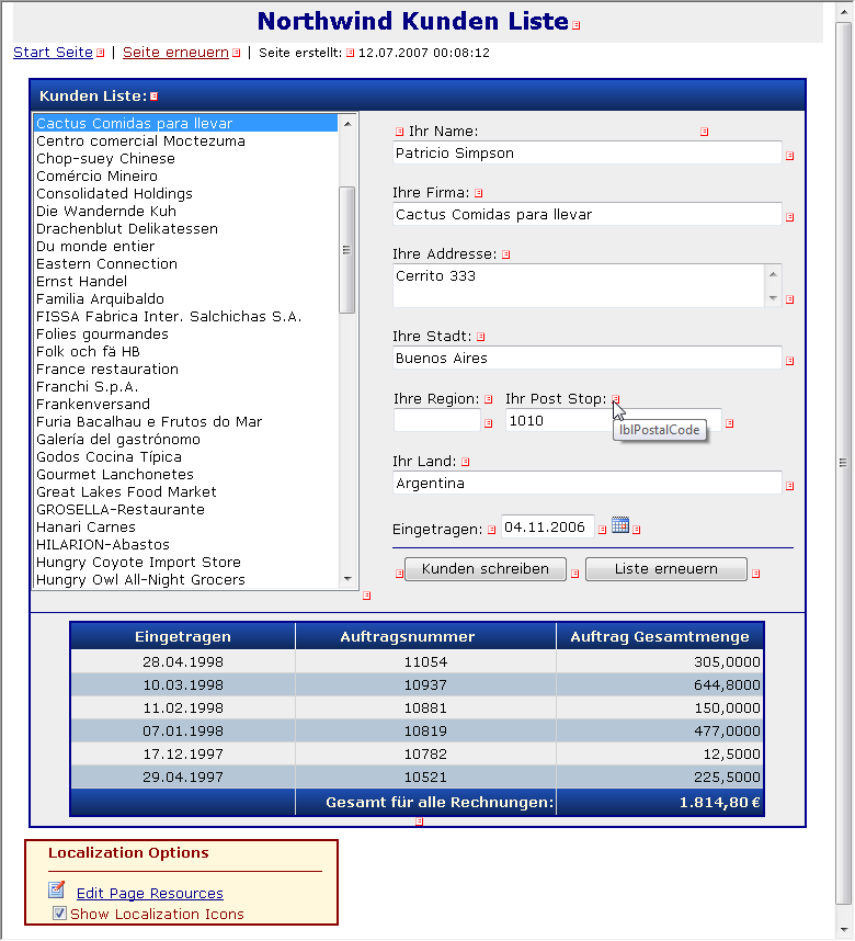 The control can be placed anywhere on the form and the control itself will show as a simple box with the options shown above. You can apply styling as you see fit. When the control is active it displays the box shown and if the Show Localization Icons checkbox is checked (maps to the wwDbConfiguration.ShowLocalizationIcons property and the web.config provider configuration section) icons are displayed next to each control that is [Localizable] on the page. Clicking the link will activate the Administration form and attempt to select the control in the list of resource ids.