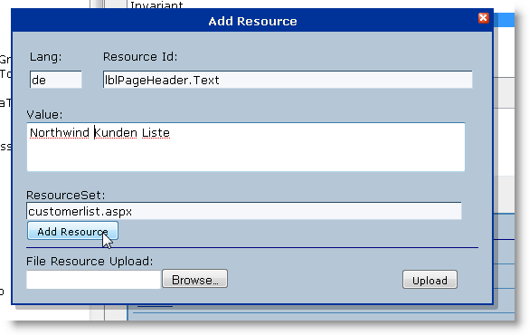 Simply enter the locale id and ResourceId (it'll default to the currently active control) and you can then add a new Resource. Add is only necessary to create a new ResourceId or a new Locale ID for a ResourceSet. Once a ResourceId exists you can simply select the language in the Languages drop down and edit the value. If a value doesn't exist it's automatically created for the given locale.