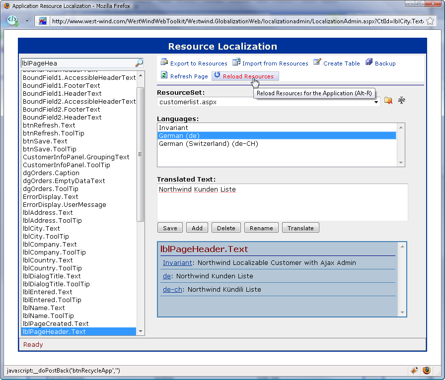 Text for each resource can simply be edited in the input box and saved. The Delete option deletes the entire resource key and all it's locale specific values. Rename allows you to rename a resource key and all of its associated locales. Note that if you have references in your ASP.NET document (meta:resource keys specifically) you have to manually update those keys to match.
