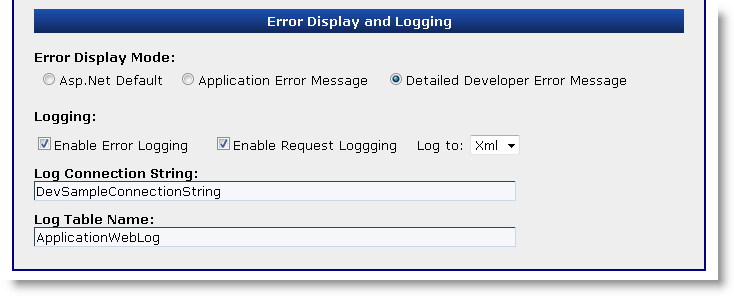 <LogManager> <add key="ConnectionString" value="DevSampleConnectionString" /> <add key="LogFilename" value="ApplicationWebLog" /> <add key="LogAdapter" value="Sql" /> <add key="LogWebRequests" value="True" /> <add key="LogErrors" value="True" /> </LogManager>