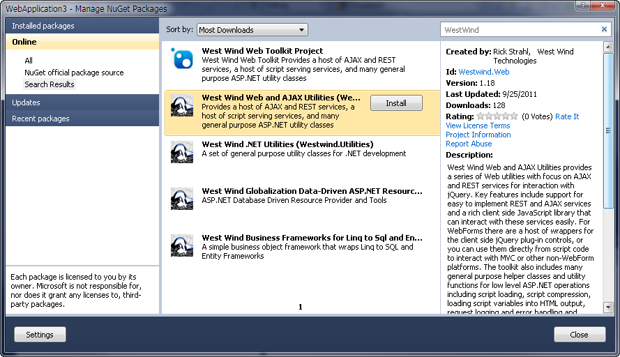 One of the easiest ways to add West Wind Web Toolkit functionality to your projects is to use Microsoft's NuGet Packaging technology. Using NuGet you can easily add components from the NuGet Web repository into your Visual Studio projects.
