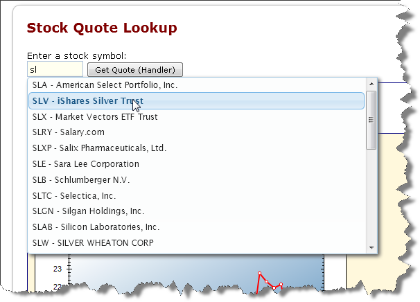 <div class="contentcontainer" runat="server" id="PageContent"> <h2>Stock Quote Lookup</h2> <div class="labelheader" style="margin-top: 20px;">Enter a stock symbol:</div> <ww:AutoComplete runat="server" ID="txtSymbol" style="width: 75px;" ServerUrl="AutoCompleteHandler.ashx?Method=GetStockLookup" /> <input type="button" id="btnGetQuote" value="Get Quote" />