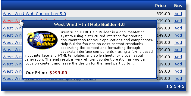 This sets up the HoverPanel control run the callback in ShowHtmlAtMousePosition mode which shows the result content in the panel at the mouse position. The main thing you need to set here is the ServerUrl which specifies where the control goes to retrieve the content. In this sample I'll go back to the same page as the main content so in theory the ServerUrl property does not need to be set. We'll use the IsCallback property of the control in code to determine the callback status and return a custom response on this page. Most of the other properties are display related to set up the shadow and opacity of the panel.