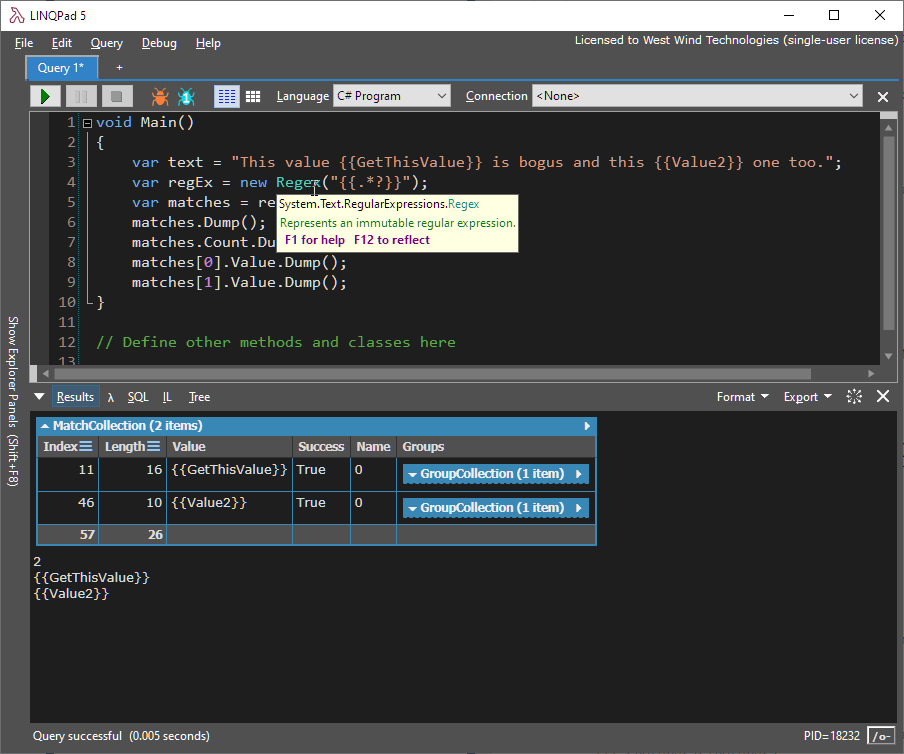 Here's some simple sample code that I'm using to work through the RegEx example mentioned at the start of this post: