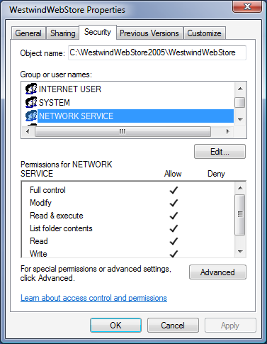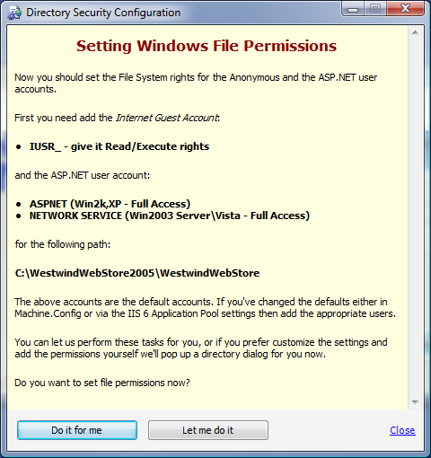 You will also need to configure the security of the Web directory in order to allow read/execute access to the Internet Guest Account (IUSR_<MachineName>), and give full access to the account the application is running under (ASPNET (iis5) or NETWORK SERVICE (iis6)).To help you with this task we can perform these settings for you from the dialog that pops up after the Virtual directory has been created. You can also choose to do it manually.