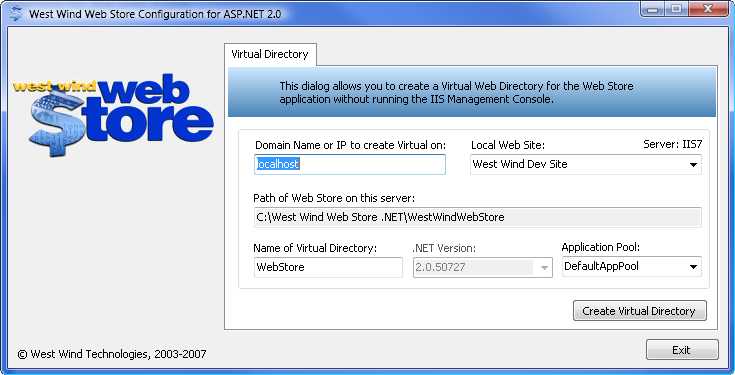 Once you're sure that your Web Server is configured, the first step after the files have been unzipped or copied to the specified directories is to run the _WebStoreConfig.exe application. This little app configures the virtual directory for the Web Store: