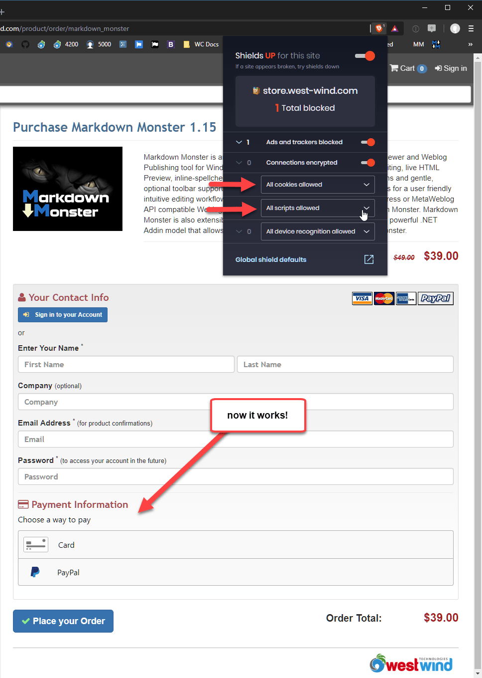 In short, if scripts or third party Cookies are blocked you cannot place an order, so please make sure you have content blockers turned off for this site.